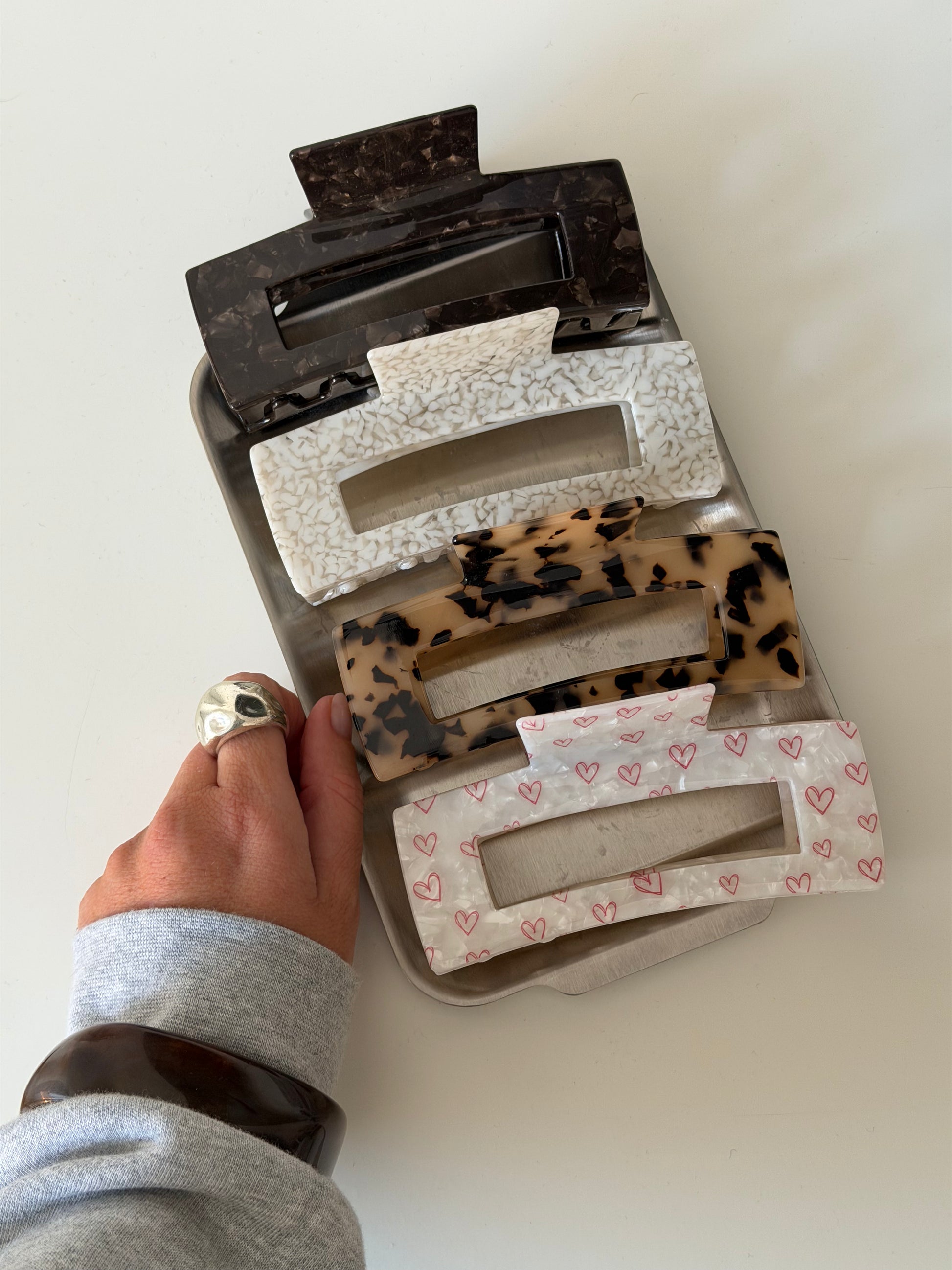 Da das Acetat handgegossen wird, sind alle Clips individuell und einzigartig. Es kann vorkommen, dass Farbe & Muster minimal von den Fotos abweichen.